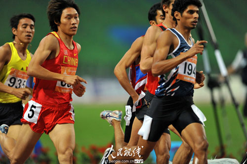 人民网广州11月24日电(记者 关腾飞摄影报道)广州亚运会田径男子800米第一轮第一组,中国选手张海坤以1分50秒01的成绩,位列小组第四,无缘决赛。伊朗选手萨贾德·穆拉迪和