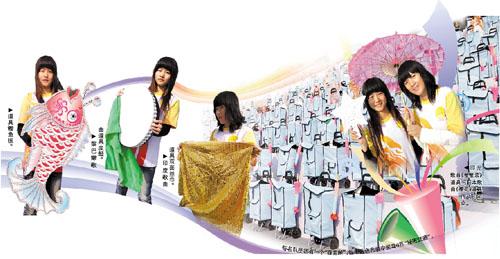 最值得一提的是,在海心沙舞台上,每名合唱队员都有一个道具“百宝箱”,这个蓝色布袋中装着6件“秘密武器”,需要配合不同歌曲来表演,营造舞台气氛。其中有《月光光》时的浪花板和鱼板,《樱花》时的粉红小伞,印尼歌曲时的星星索,印度歌曲时的纱巾,黎巴嫩歌曲时的小鼓。