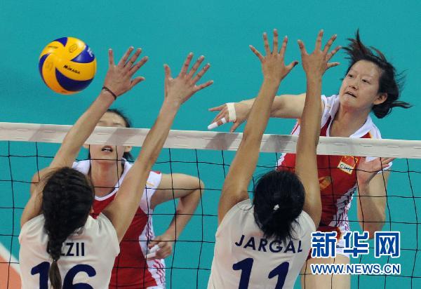 11月21日,中国队球员陈丽怡(右)在比赛中扣球。当日,在第16届亚运会女子排球预赛中,中国队以3比0战胜蒙古国队。新华社发(李秋婵摄)