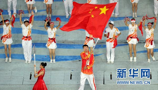 11月27日,中国男篮运动员王治郅在闭幕式上挥舞国旗入场。当日,第16届亚运会闭幕式在广州市海心沙岛举行。 新华社记者杨磊摄