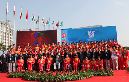 广州亚运会胜利闭幕,运动员村并没有“休息”,经过4天紧锣密鼓地转场、准备,迎来了广州亚残运会的客人。8日,广州2010年亚洲残疾人运动会运动员村开村暨中国体育代表团入村欢迎仪式,在亚运城运动员村升旗广场隆重举行。中国残联党组书记、理事长,中国残奥委员会主席、广州亚残运会组委会执行主席王新宪;中国残联党组副书记、常务副理事长,广州亚残运会组委会副主席王乃坤女士;中国残联党组成员、副主席,中国残奥委员会执行主席、广州亚残运会组委会副主席、中国体育代表团团长吕世明;国家体育总局党组成员、副局长、中国残奥委会执行主席、广州亚残运会组委会副主席、中国体育代表团团长冯建中;中国残联党组成员、副理事长、体育部主任,中国残奥委员会常务副主席,广州亚残运会组委会副秘书长、中国体育代表团执行团长贾勇;亚残奥委会秘书长马利尼·拉贾萨加兰女士;广东省委常委、广州市委书记、广州亚残运会组委会副主席兼秘书长张广宁;广东省副省长、广州亚残运会组委会副主席林木声;广州市委副书记、广州市市长、广州亚残运会组委会副主席万庆良;广州市委常委、亚运城赛区领导小组组长、运动员村村长孔少琼女士;广州市委常委、秘书长陈如桂;广州市副市长、广州亚残运会组委会常务副秘书长许瑞生、广州市副市长、广州亚残运会组委会副秘书长陈国和广州市政府秘书长谢晓丹等领导和嘉宾,以及200名中国体育代表团成员出席了仪式。