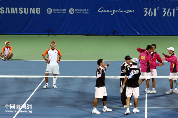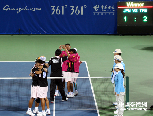 中国台湾网11月15日广州消息 第十六届广州亚运会软式网球男子团体赛决赛,14日下午在广州天河体育中心球场举行,中华台北队在软式网球男子团体赛中上演“惊天大逆转”,以2:1战胜卫冕冠军日本队,摘获代表团在本届亚运会上的首枚金牌。(记者 李徽)