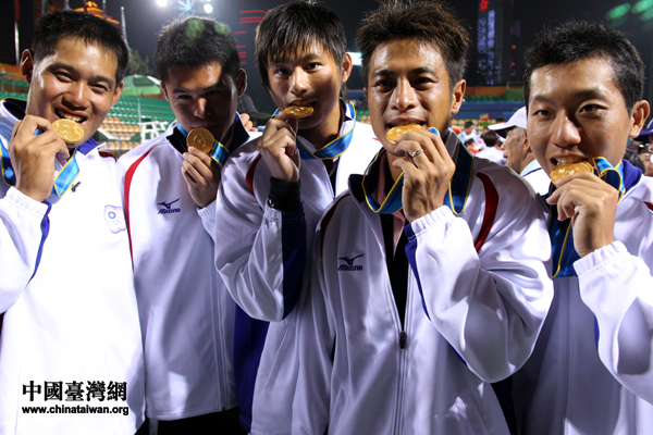 五位中华台北队选手亲吻金牌。(中国台湾网 钟宝华 摄)