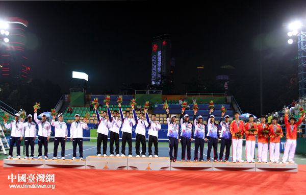 中华台北队软式网球男团夺金,站上最高领奖台。(中国台湾网 钟宝华 摄)