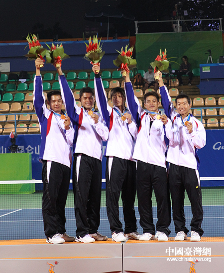 广州亚运软式网球比赛,中华台北队男团夺金,站上最高领奖台。(中国台湾网 钟宝华 摄)