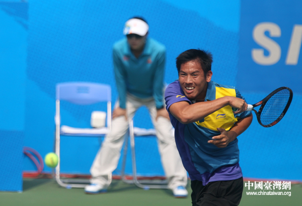 16日,第十六届广州亚运会男子网球团体赛决赛正在进行,中华台北队与乌兹别克斯坦队争夺冠军。第二场单打由中华台北队杨宗桦对乌兹别克斯坦选手阵丹尼斯·伊斯托明。图为杨宗桦奋力回球。(中国台湾网 钟宝华 摄)