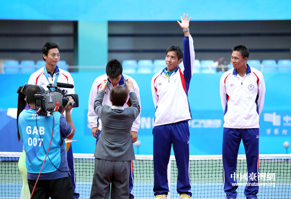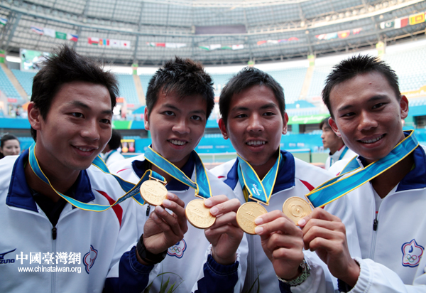 中华台北队男网团体选手展示金牌。(中国台湾网 钟宝华 摄)