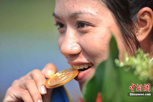 11月23日中午,亚运会女子公路个人赛颁奖仪式上,获得金牌的中华台北选手萧美玉笑衔金牌,眼角还含着泪水。中新社记者 柯小军 摄
