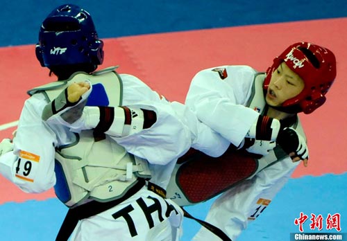 11月20日,中华台北选手魏辰洋(红)夺得广州亚运跆拳道男子58公斤级冠军。中新社记者 王东明 摄
