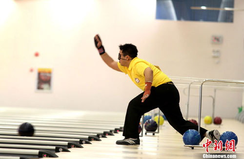 12月14日,广州亚残运会天河保龄球馆,单人赛TPB1决赛中,来自中华台北的选手廖宏昌放手一搏,体现了不屈不挠、顽强拼搏的体育精神。中新社发 张美安 摄