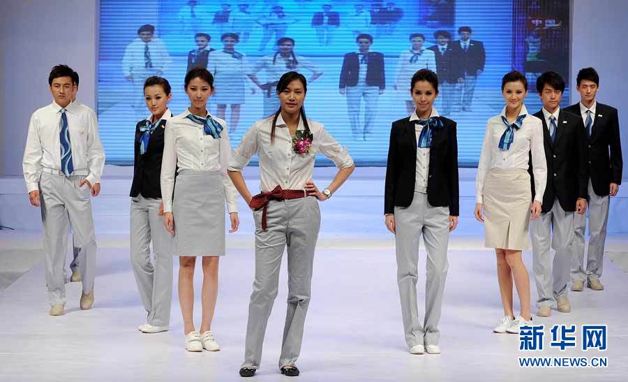 11月7日,作为一名广州亚组委志愿者部的工作人员,羽毛球名将谢杏芳(左四)穿着亚运官员制服在T台上进行展示。当日,广州亚运、亚残运会官员、工作人员、亚运技术官员(裁判)和技术代表(仲裁)总共5套亚运官方正装制服在广州发布。加上早前发布的亚运会颁奖礼仪服“行云流水”和白色立领升旗服,至此,7套亚运会官方服装已经全部公开亮相。 新华社记者 梁志玮 摄