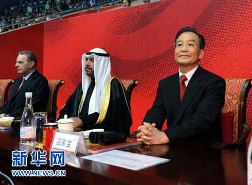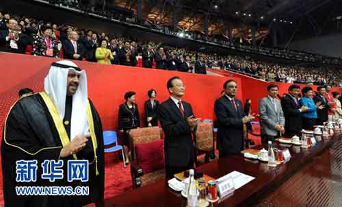 1月12日晚,第16届亚洲运动会开幕式在广州海心沙岛隆重举行。这是国务院总理温家宝出席开幕式。 新华社记者张铎摄