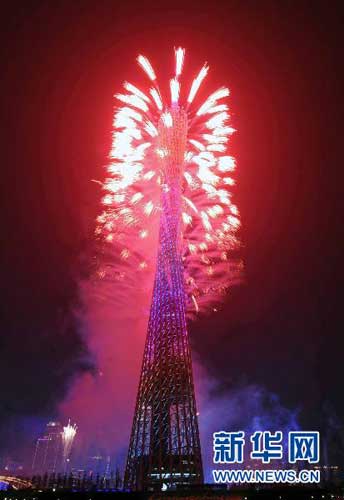 月12日,第16届亚洲运动会开幕式在广州海心沙岛举行。这是在广州塔燃放倒计时烟花。 新华社记者李勇摄