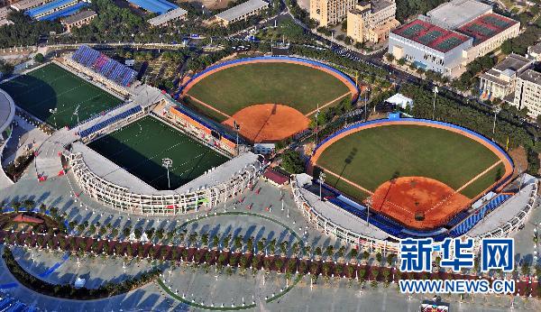 图为航拍的广东奥体中心棒球场和曲棍球场(摄于10月29日)。在广州亚运会期间,广东奥林匹克体育中心场馆群将举行田径、游泳、射击、网球、棒球等项目的比赛。新华社记者刘大伟摄