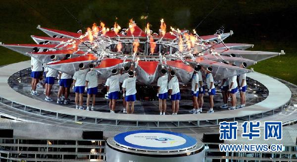 第十四届亚运会于2002年9月29日至10月14日在韩国釜山市举行,44个国家和地区的上万名运动员参赛。中国、韩国和日本列奖牌榜前三位。本届亚运会共产生427枚金牌,刷新世界纪录22项、创造亚洲新纪录43项。图为在第十四届亚运会开幕式上,亚奥理事会成员的火种汇集在一起。新华社发
