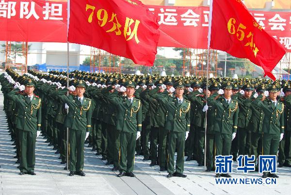 10月23日,武警官兵在宣誓。当日,武警部队在广州举行亚运安保誓师动员大会。至此,担负亚运安保现场执勤的武警官兵全部走上执勤岗位,这标志着武警部队亚运安保工作已经全面启动,进入实质保卫阶段。新华社发(张大岗摄)