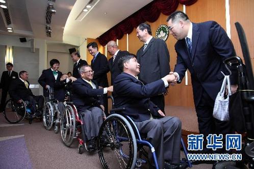 12月1日,中国澳门特区行政长官崔世安(右)与运动员握手。当日,参加广州2010年亚洲残疾人运动会的中国澳门代表团在中国澳门特区政府总部举行授旗仪式。中国澳门共派出14名运动员参加4个比赛项目。新华社发 (张金加摄)