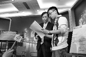 图为甘新副市长在与网友展开在线交流期间,甘新副市长(左)接收《网友关于广州市交通补助发放问题的意见》。大洋网供图