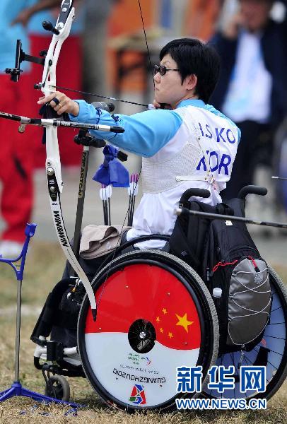 12月13日,韩国选手高希淑在比赛中。当日,在广州2010年亚残运会女子团体反曲弓公开级排名赛中,韩国队以1811环的总成绩打破世界纪录。新华社记者陈晔华摄