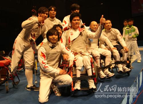 12月16日,广州亚残运会轮椅击剑男子花剑团体决赛在大学城广州大学体育馆举行,中国选手最终以45-27战胜中国香港选手,夺得金牌。人民网记者刘龙摄