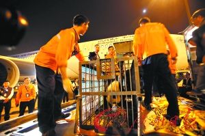 月28日报道23时58分,第一批两只熊猫宝宝津柯和博斯同时被运下飞机,2分钟后就被装上了前来迎接它们的车辆。其余4只熊猫在第二批一起下了飞机,所有熊猫宝宝在今日凌晨0时10分装车完成,被送往香江野生动物园。