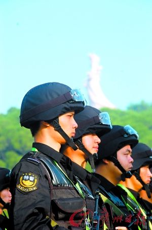 誓师大会上,60名特警队员佩戴防暴头盔配护目镜,穿作训服、作训背心、作战手套,带10头警犬,持微型冲锋枪、狙击步枪,显得威风凛凛。而另外的4个武警安保方队、4个边防安保方队、消防安保方队、防恐处突安保方队、陆军方队、海军方队、空军方队也分别亮相。