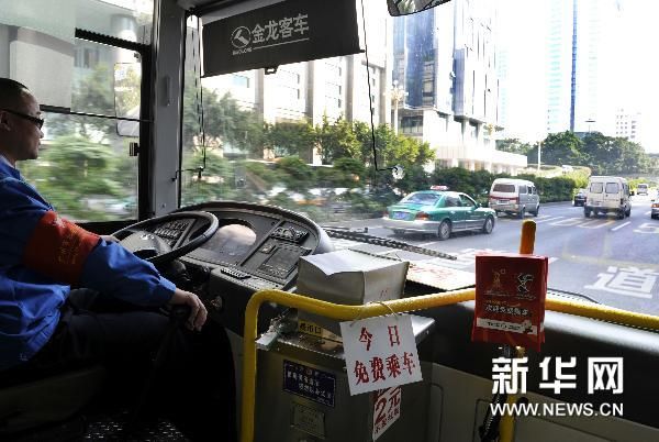 11月1日,广州市的公共汽车上均挂有免费乘车的提示牌。