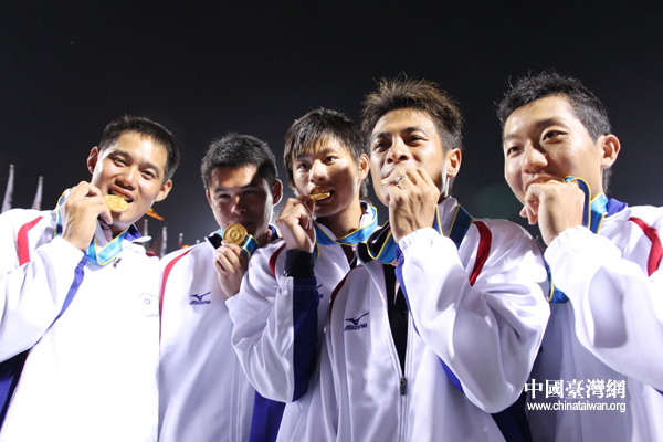 五位中华台北队软式网球男选手高兴的亲吻金牌。(中国台湾网 钟宝华 摄)