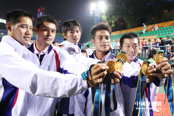 广州亚运软式网球比赛,中华台北队男团夺金,站上最高领奖台。(中国台湾网 钟宝华 摄)