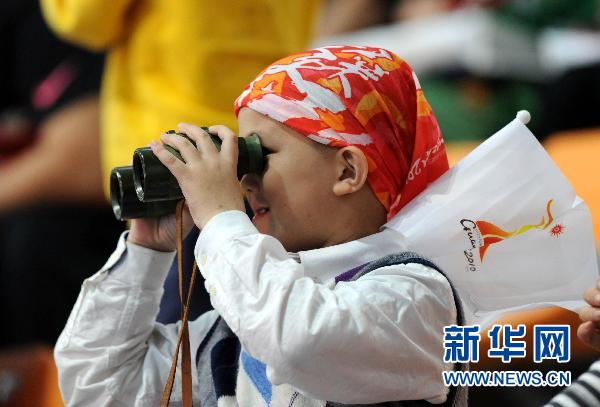 11月27日,头戴“志愿彩”的小观众用望远镜观看闭幕式前的表演。当日,第16届亚运会闭幕式在广州市海心沙岛举行。新华社记者李勇摄