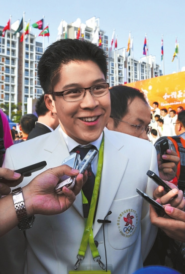 升旗仪式结束后,霍启刚便和香港代表团的运动员们簇拥在一起合影留念,作为代表团副团长的他,自然没有忘记自己的身份。“这一次你会去看跳水吗?”当华西都市报记者将这个问题抛给霍启刚时,他笑了一笑:“我就知道你要问我这个问题,在香港我就一直被问这个问题,到这里来还是被问这个问题,哈哈。”霍启刚的普通话非常标准,周围的香港媒体听到了霍启刚这样回答,也都笑了起来。