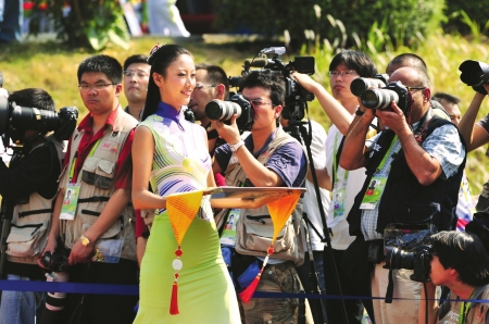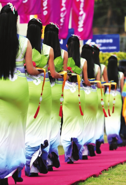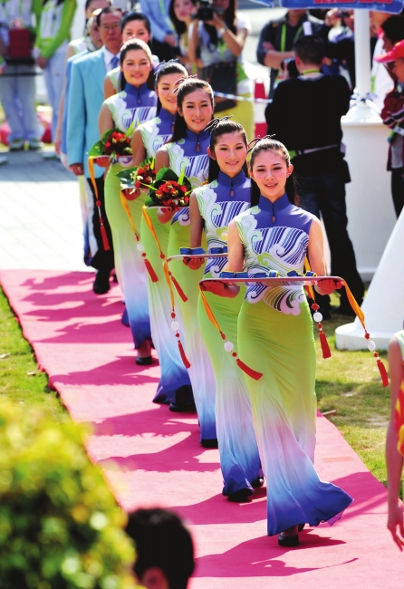 身穿﹃行云流水﹄、头顶亚运标志,她们的笑容需要精确到牙齿,她们的举手投足都可以用厘米测量,她们是亚运赛场上一道最美的风景。