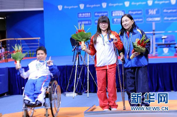 12月14日,冠军中国选手崔哲(中)、亚军菲律宾选手阿切列 吉翁(左)和季军哈萨克斯坦选手卡比拉 阿斯卡洛娃在颁奖仪式上。当日,在2010年广州亚残运会女子44公斤级举重比赛中,中国选手崔哲以95.0公斤的成绩夺得金牌。新华社记者范长国摄