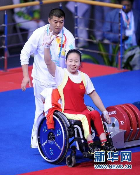 12月14日,中国选手石珊珊向观众致意。当日,在2010年广州亚残运会女子48公斤级举重比赛中,石珊珊以110.0公斤的成绩夺得金牌。新华社记者范长国摄