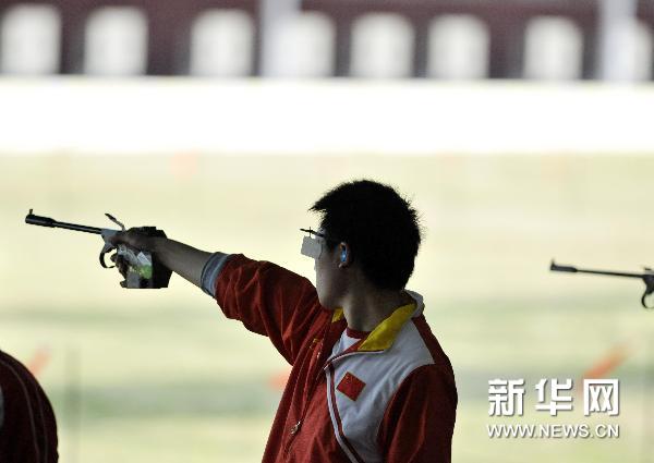 11月13日,中国选手伍晶在男子50米手枪比赛中。当日,在第16届亚运会射击项目比赛中,中国队获得男子50米手枪团体亚军。新华社记者陈晔华摄