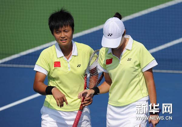 11月14日,中国队选手郝洁/辛雅妮(左)在团体半决赛第三场比赛中,以3比5负于日本队选手佐佐木舞/大庭彩加。当日,在广州天河网球学校举行的第16届亚运会软式网球女子团体半决赛中,中国队以1比2的总比分负于日本队,无缘决赛。新华社发(李秋婵摄)