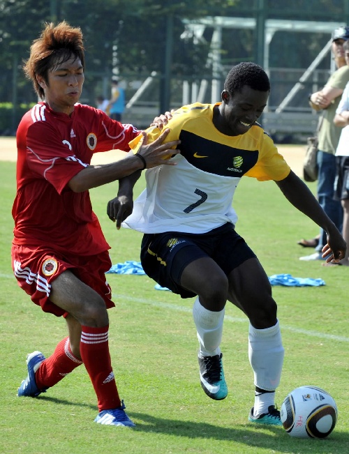 香港,2010年9月28日 (亚运会)(5)足球——中国香港足球队备战广州亚运会 9月28日,香港队球员翟廷峰(左)防守澳洲U19青年队球员的进攻。当日,为备战11月在广州举行的第16届亚洲运动会,中国香港足球队在香港晒草湾球场与澳洲U19青年队进行一场友谊赛,最终中国香港队以2比2战平澳洲U19青年队。 新华社记者卢炳辉摄