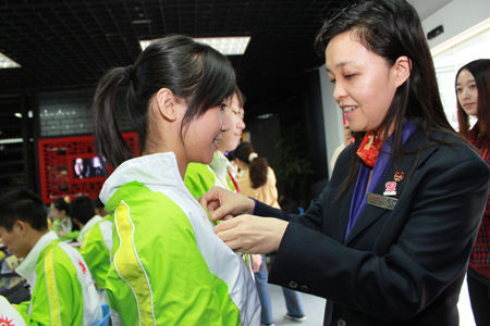 团省委副书记为优秀亚运志愿者代表戴“创先争优党团员志愿者徽章”
