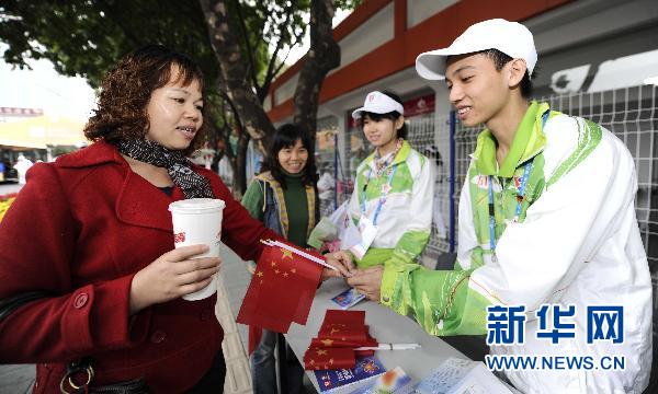 12月14日,志愿者陈罗权(右)给观众分发小国旗。在广州2010亚残运会轮椅网球赛场,有两名残疾人志愿者服务亚残运会赛场。他们以自己的热情,积极投入到志愿者队伍中,贡献自己的一份爱心和力量。来自广州残疾人英语培训中心的陈罗权在7岁的时候,在一次车祸中造成脑部受伤,导致右下肢残疾,行动不便。陈罗权从开赛以来一直守在观众咨询台,虽然行动不方便,却在积极为观众分发比赛手册和小红旗。志愿者同伴们考虑到陈罗权的特殊情况,还专门给陈罗权安排在座位上服务。他说:“能够参与到服务亚残运会,看到残疾人选手比赛,对我是莫大的鼓励”。另外一名失语志愿者叫刘伟强,是一名广州残疾人学校的手语老师,专门为赛场的观众和运动员提供手语服务,他还是志愿者们的手语老师,指导志愿者们学习手语。刘老师在赛场没事的时候也闲不下来,承担了给志愿者们分发食品和饮料的任务。赛场内的残疾人运动员在拼搏比赛,赛场外的残疾人志愿者也在尽职尽责提供志愿服务。 新华社记者岳月伟摄