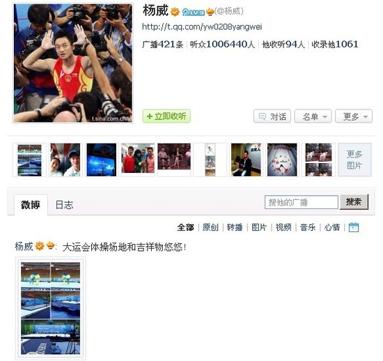 熟悉中国体操全能王杨威的人都知道,他对大运会有着一份特殊的感情。随着2011年深圳大运会的日益临近,深圳越来越能感受到大运的气氛。街头林立的旗帜,经常可见造型独特的U站,还有穿着橙色服装的城市志愿者,距离大运开幕,只有1天了。今天(8月11日)上午,杨威身临其境在微博中,秀出大运会体操场地和吉祥物悠悠。