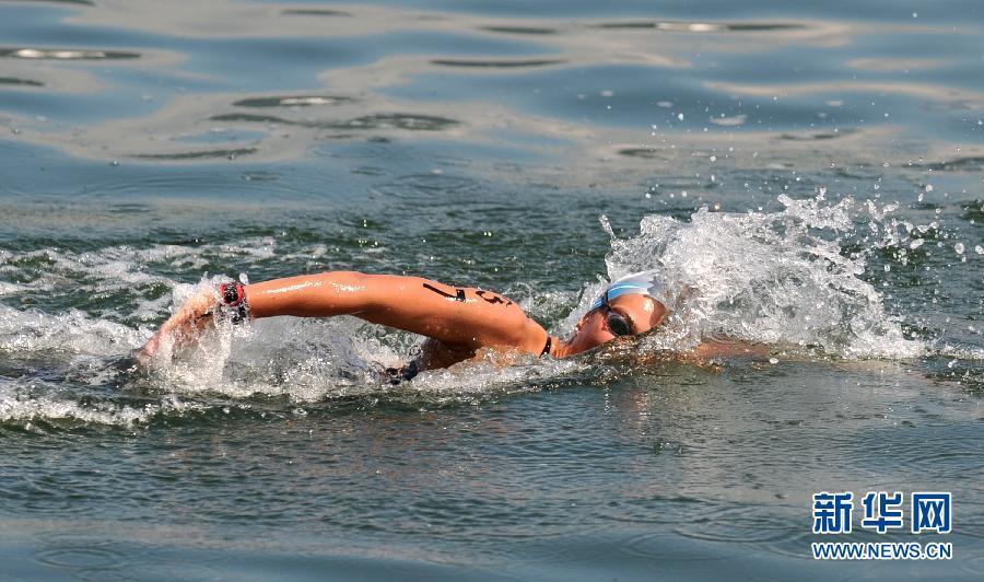 8月13日,在第26届世界大学生运动会游泳项目公开水域女子10公里比赛中,布鲁尼以2小时06分49秒314的成绩夺得金牌。新华社记者卢汉欣摄