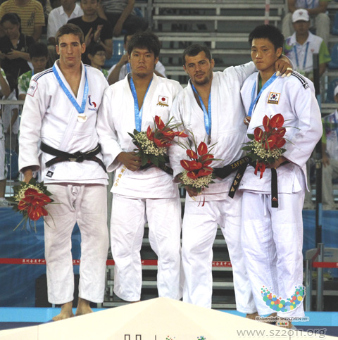 冠军日本选手堀和龙之介(左二,HAGA Ryunosuke,音译)、亚军法国选手德尔韦尔(左一,DELVERT Clement)、季军俄罗斯选手穆罕默多夫(右二,MAKHMADOV Zafar)和韩国选手金京泰(KIM Kyeong Tae,音译)在颁奖仪式上。当日,在第26届世界大学生运动会男子柔道100公斤级比赛中,堀和龙之介获得冠军。(官方图片社 张杰 摄)
