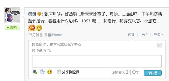 如今,再次站在世界级赛事的跳水舞台上,秦凯希望能够克服109的难度动作。刚刚到达深圳,秦凯就通过微博表达了自己的决心:“到深圳咯,好热啊...后天就比赛了。真快......加油吧,下午和搭档磨合磨合...看看用什么动作,109?嗯......我看行...我要克服它,征服它...”