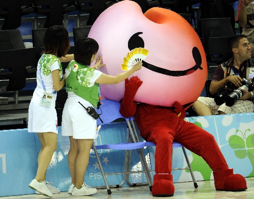 深圳,2011年8月14日 (大运会·哈哈镜)游泳——“懒惰”的UU 8月14日,在第二十六届世界大学生夏季运动会游泳比赛开始前,进行热场表演的吉祥物UU偷起了懒,旁边的志愿者忙上前给他扇扇子。 (新华社记者 梁旭 摄)