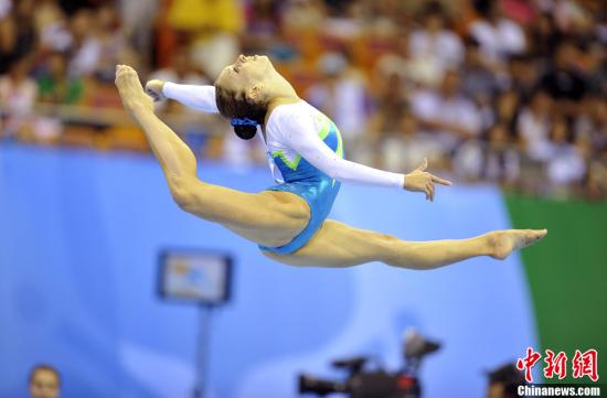 8月13日,深圳大运会竞技体操女子团体决赛在宝安体育中心进行,日本、乌克兰和俄罗斯分别获得冠亚季军。图为俄罗斯选手在平衡木比赛中。中新社发 陈文 摄