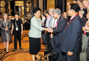 刘延东与出席论坛开幕式的大学校长握手。