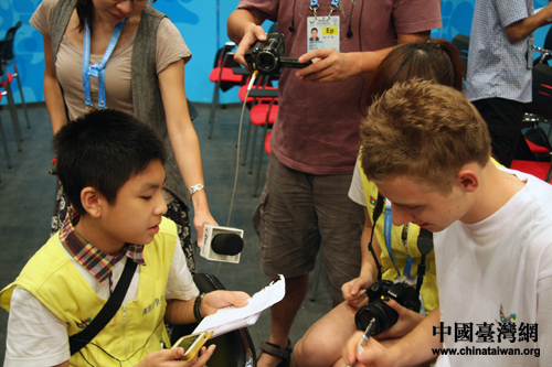 深圳小学生与外国青年记者在开营仪式上交流。(中国台湾网 于斯文 摄)