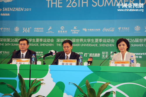 深圳大运会筹备工作新闻发布会在主媒体中心召开。大运会组委会副秘书长、深圳市政府副秘书长黄国强和组委会专职新闻发言人王梅就大运会筹备工作进行了介绍,并回答记者提问。(中国台湾网 于斯文 摄)