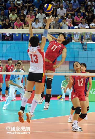 中国队员13号陈伊娜网前拦截中华台北队11号球员吴淑芬的大力扣球。(中国台湾网 董宪超 摄)