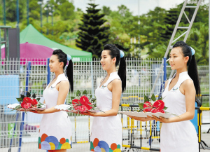 本届大运会共有350名从全国各地海选而来的颁奖礼仪志愿者,包括290名女生和60名男生。昨天,观众在13个场次的颁奖仪式中领略了他们的风采。大运期间,他们将在32个决赛场馆举行的306场颁奖仪式中颁发2000多枚奖牌。